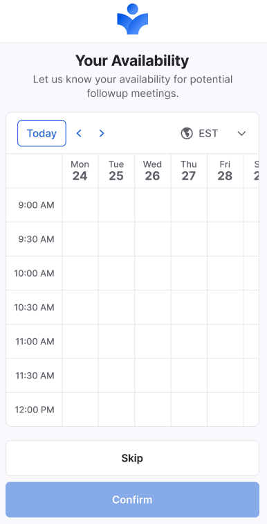 Once a candidate has completed an interview they will be given the option to fill out their availability for a follow-up interview for the following 12 days. On this page, candidates have the option to adjust their timezone, specify their availability, or choose to skip this step.