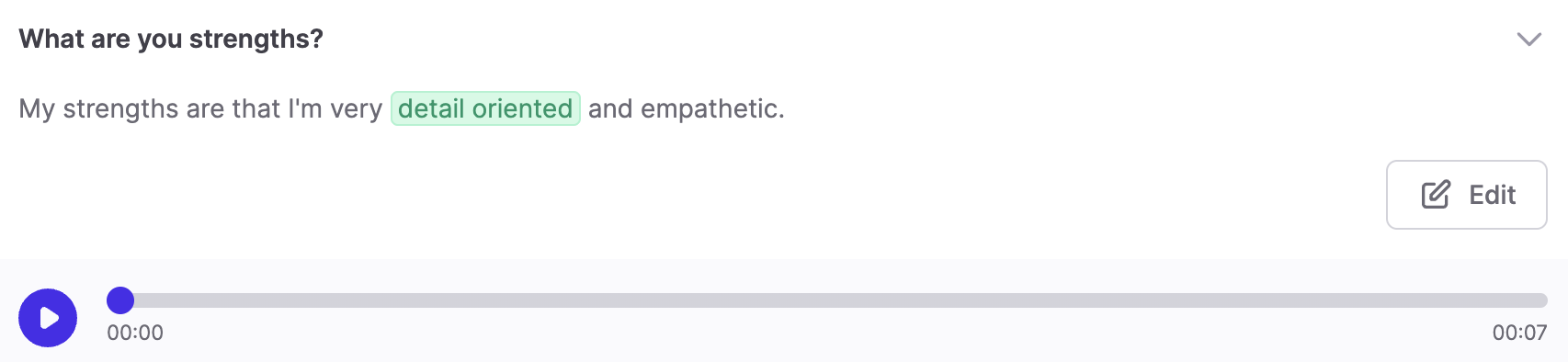When reviewing the transcription, keywords will be highlighted indicating which keywords the candidate used.